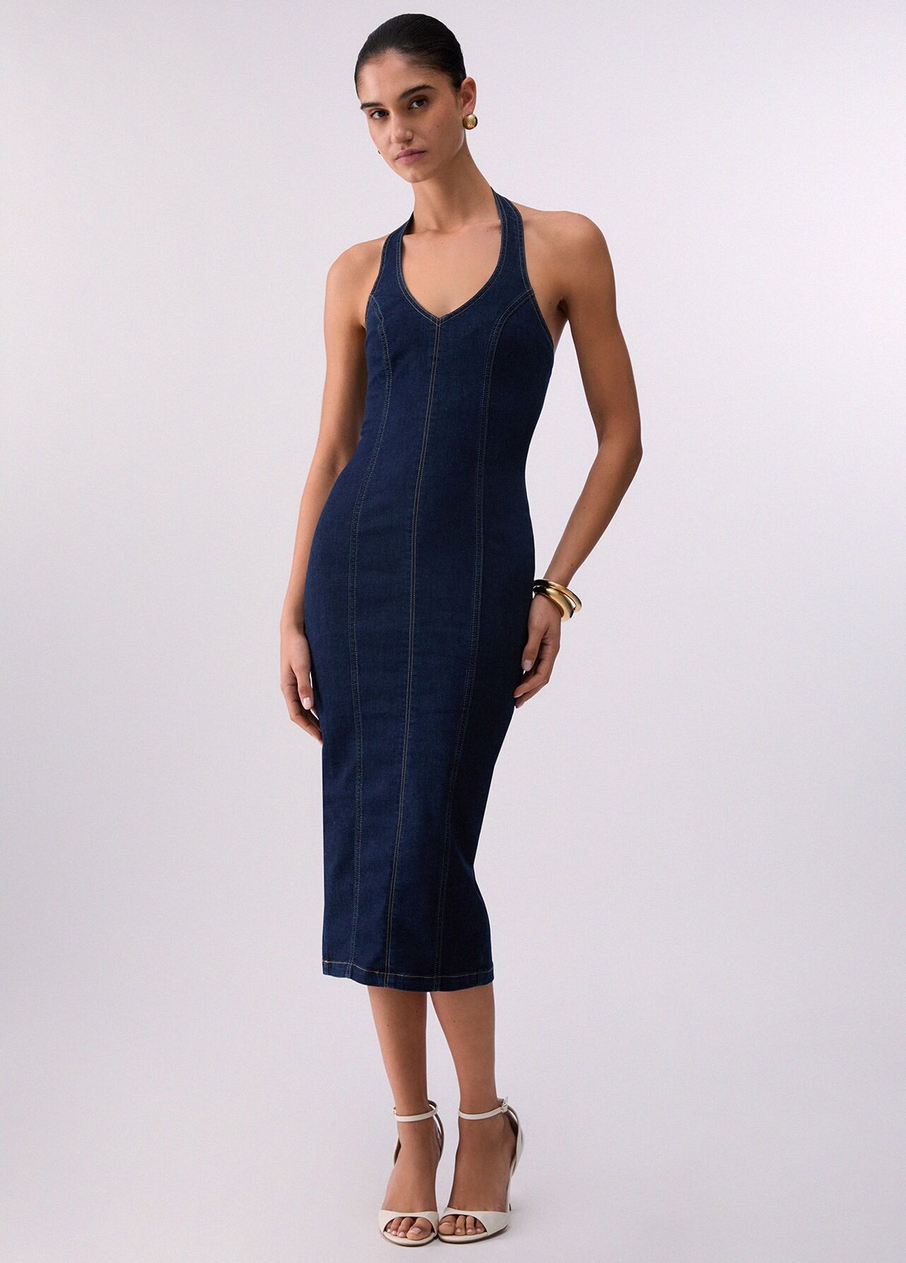• Esnek denim midi elbise